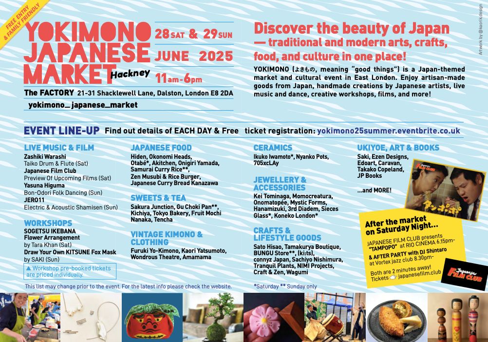 We’re teaming up with Yokimono Japanese Market who are back at The Factory E8, just a few minutes walk around the corner from The Rio Cinema in Dalston. They are curating the most incredible selection of Japanese art, crafts and food. An unmissable event for anyone in London interested in Japanese culture, the free day market will transport you to the far east with Japanese food and sweets, music, dance, workshops, art and crafts, vintage kimono, jewellery and more. Have an early Japanese dinner at the market then join us for an early evening screening of the greatest film about food ever made – Tampopo.