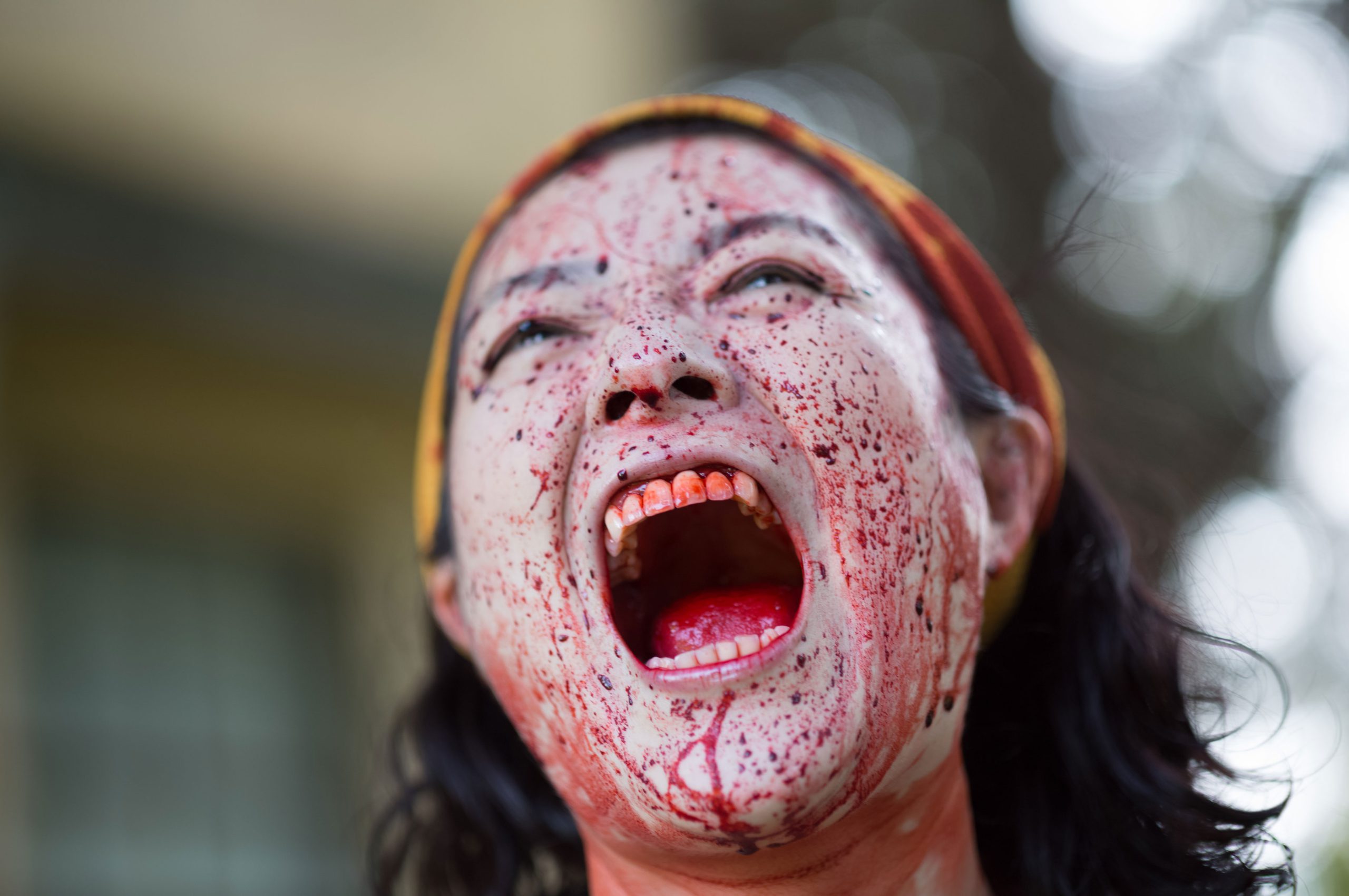 As the “zombies”—a motley assortment of extras in tattered rags and graying prosthetics—breach the barricades, the line between scripted slaughter and visceral survival blurs in a whirlwind of flailing limbs, exploding entrails (courtesy of unreliable squibs), and Higurashi’s unhinged rants about “true filmmaking.” He prowls the set like a possessed shaman, yelling “Action!” over guttural moans and clattering props, his eyes wild with the delusion that “there is no fiction, no lies—this is reality!” The plant’s cavernous corridors, lit by harsh fluorescents and flickering strobes, amplify the claustrophobic chaos: overturned tables become barricades, flickering monitors capture the carnage in grainy feeds, and the air hums with the wet smack of fake gore turning suspiciously sticky. It’s a symphony of mishaps—actors corpsing mid-scene, cables snagging heels, and a persistent undercurrent of explosive diarrhoea gags that weaponise bodily humour against horror’s pomposity.